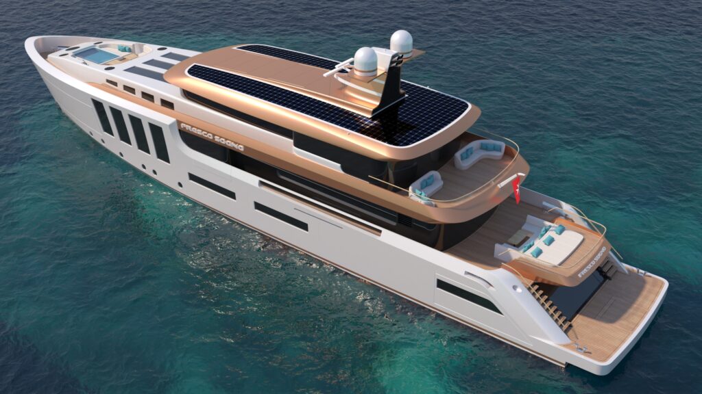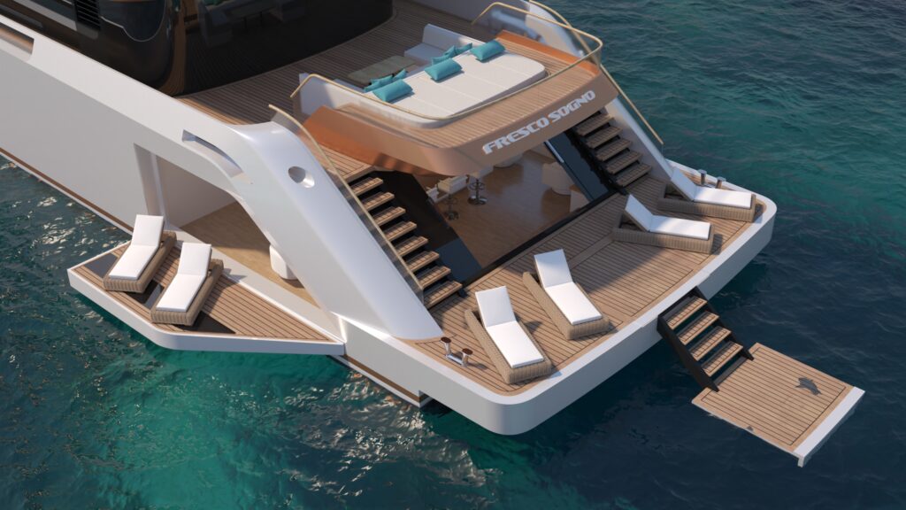 Every detail of the yacht has been carefully crafted to fully satisfy the owner’s needs. Comfort is at the heart of its design, with all the necessary amenities to make life on board easy and enjoyable. The yacht features an innovative concept, characterized by a sleek and dynamic silhouette that enhances both aesthetics and performance. Unlike many vessels in its class, M/Y Fresco Sogno does not have a sun deck, a stylistic choice that gives it a more athletic and muscular profile, highlighting its bold character and clean, flowing lines.