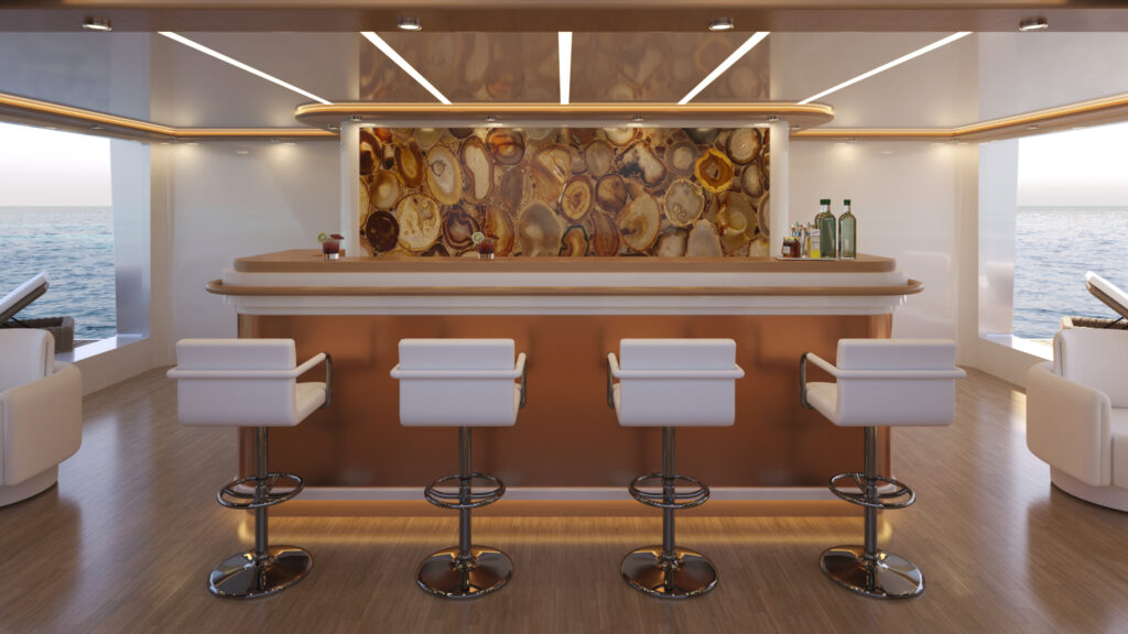 The Lower Deck is designed to provide a direct connection with the sea, starting with a spacious Beach Club. This area is meant for daytime relaxation, featuring two side openings, a large swim platform, and a wide sliding glass façade that brings natural light and sea views into the space. The Beach Club creates an open, inviting environment where guests can unwind right at the water’s edge.